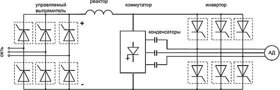 Российская схема Первыми в начале 80-х годов были созданы ВПЧ, содержащие автономные инверторы тока на SCR-тиристорах. Переключение тиристоров в таких АИТ обеспечивается введением тем или иным способом дополнительной эдс в контур коммутации. В качестве источника такой эдс в этих инверторах используют конденсаторы.