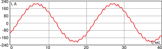 Осциллограмма на рис. 2, снятая на электроприводе ЭТВА питательного насоса ТЭС, иллюстрирует формы тока в фазе и линейного напряжения статора асинхронного двигателя при частоте порядка 32 Гц.
